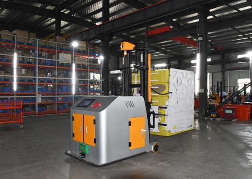 本項目包含多臺激光導航平衡重抱夾式移動機器人,額定載荷1000KG,最大舉升高度為3.5米,使用激光純反導航,調度交管策略+避障激光雷達+防撞觸邊三重安全檢測系統,可以確保在行進過程中安全、穩定、高效的運行。平衡重抱夾式移動機器人可實現“堆垛、搬運”雙重功能,既解決了倉庫內巖棉產品兩層堆疊存儲,又實現了物料跨區域自動化流轉。