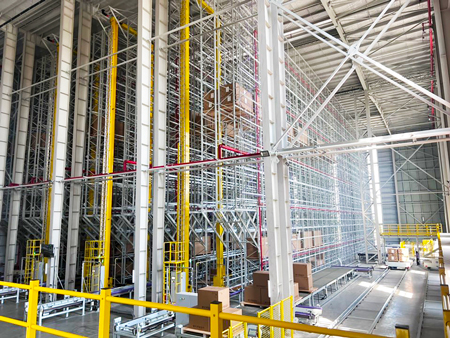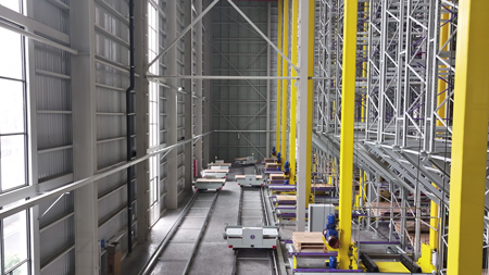宇鋒智能在詳細調研客戶需求之后,針對產品特性、業務流程及場地布局特點等多個維度深入分析,并結合3D仿真技術對流程不斷進行優化和改進,最終規劃設計以“托盤式堆垛機立體庫存儲系統+環穿RGV倉儲系統+多物流設備協同運輸”作為項目整體解決方案。從單一的智能存儲功能向涵蓋物料搬運、區域配送、自動存儲為一體的智能化物流系統延伸,通過智能倉儲軟硬件有機融合,實現了多種規格家具套件成品的自動輸送和存儲,在存儲容量、精益化管理以及降本增效等方面得到顯著提升。