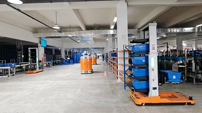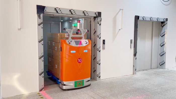 搬運式AGV與現場6部電梯自動通信對接,實現了一樓與三樓之間的半成品入庫、成品出庫,以及二樓到三樓之間的半成品包裝返庫等業務。